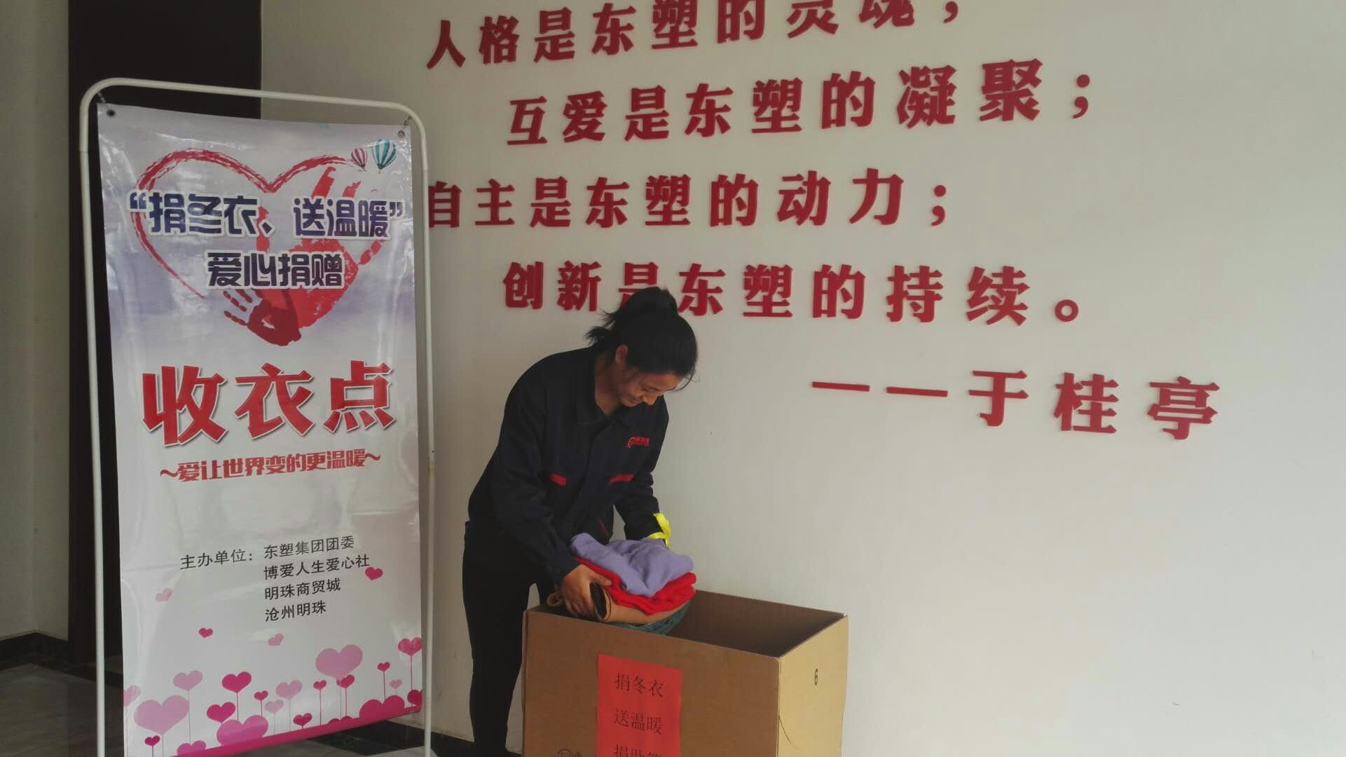 10月19日,潔通塑料“捐冬衣送溫暖”愛(ài)心捐贈(zèng)活動(dòng)溫馨進(jìn)行明珠大廈、明珠商貿(mào)城、御河酒業(yè)營(yíng)銷(xiāo)公司、御河酒業(yè)生產(chǎn)公司、頤和大酒店、滄州明珠北廠區(qū)、滄州明珠技術(shù)為本區(qū)新能源材料工業(yè)園區(qū)、潔通公司、威達(dá)公司,潔通九大園同時(shí)啟動(dòng),愛(ài)心捐贈(zèng)冬衣活動(dòng)!本次捐贈(zèng)活動(dòng)由潔通塑料團(tuán)委與滄州博愛(ài)人生愛(ài)心社聯(lián)合主辦,明珠商貿(mào)城、滄州明珠協(xié)辦。明珠商貿(mào)城的商戶們積極參與,踴躍捐贈(zèng)過(guò)冬的新衣成包成捆的新衣服被送了過(guò)來(lái),這些都是商戶們?nèi)粘dN(xiāo)售的產(chǎn)品。